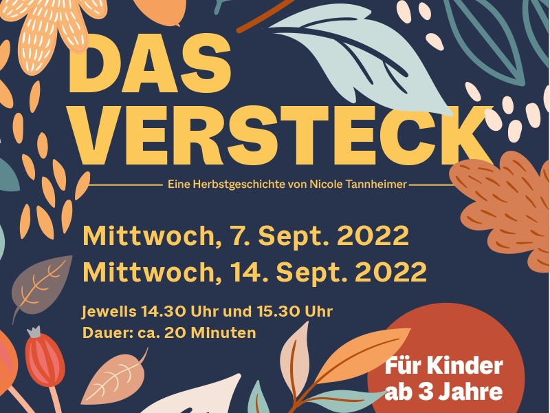 Am 7. und 14. September 2022, jeweils 14.30 Uhr und 15.30 Uhr, dreht sich in der Flauderei alles um die Herbstgeschichte "Das Versteck" von Nicole Tannheimer. Ein spannendes Vergnügen für alle Kinder ab 3 Jahren, Dauer ca. 20 Minuten.