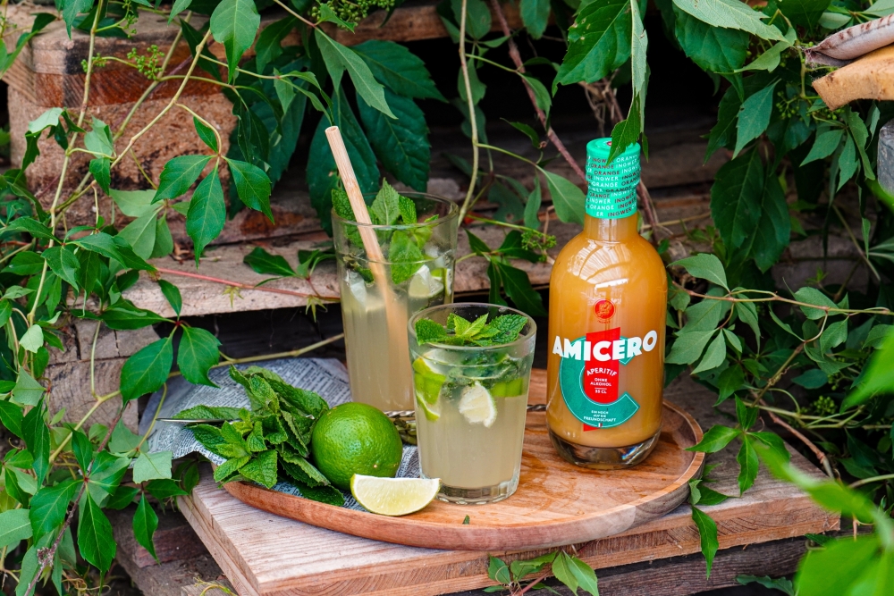 1. Für ein Glas: Limette und Minze in ein Glas geben und mit dem Amicero übergiessen und mit einem Stössel andrücken, bis Limettensaft ausgetreten ist.