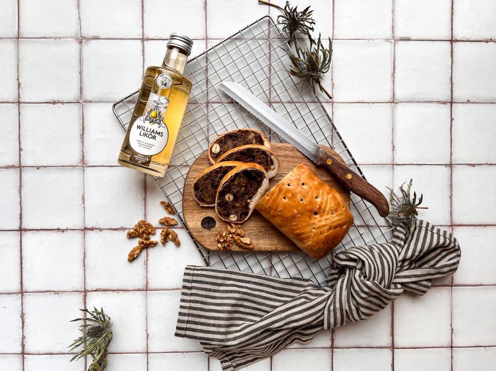 - Die Dörrbirnen, Nüsse und Feigen fein hacken, in eine Schüssel zusammen mit den Rosinen geben und über Nacht mit dem Williams stehen lassen.