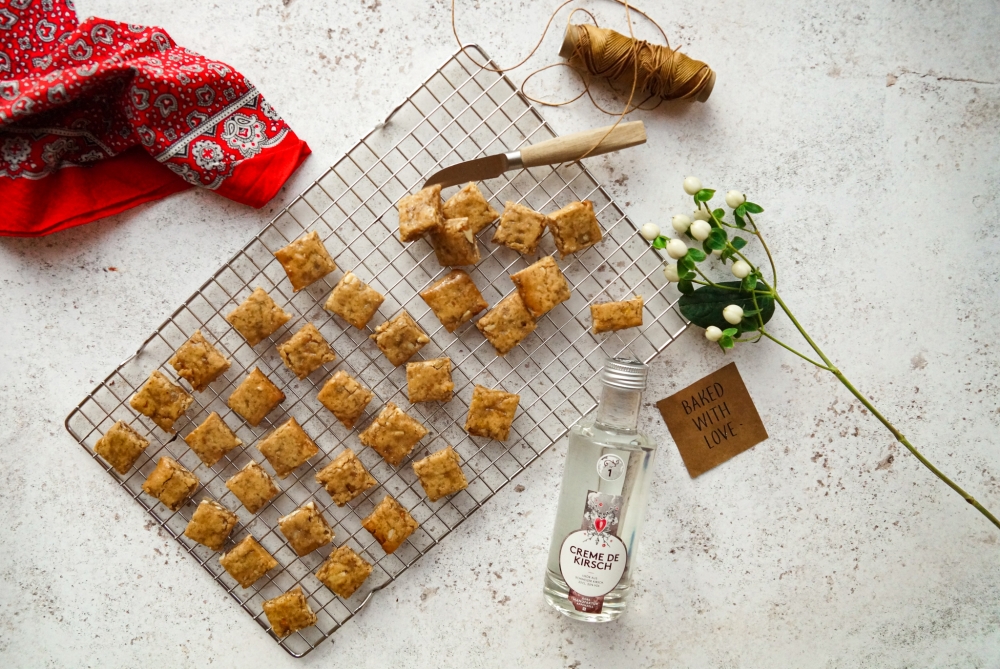 4. Im vorgeheizten Ofen bei 220 °C für ca. 15 Minuten backen, Glasur aus Puderzucker und Crème de Kirsch mischen und auf dem Teig verteilen. Sofort den Teig in Quadrate schneiden, auskühlen lassen.