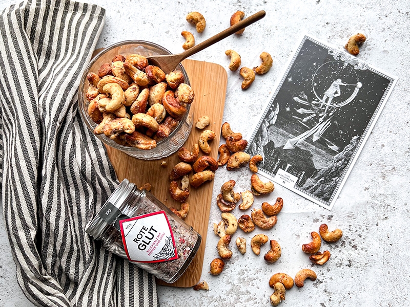 2. Das Gewürzsalz Rote Glut mit dem Mörser fein mahlen. Anschliessend das Eiweiss mit dem Honig vermengen, Gewürzsalz beigeben und über die Cashewnüsse giessen.