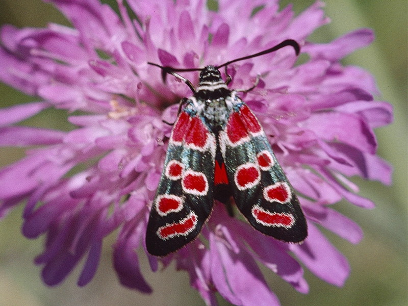 Dieser Flickflauder ist im Bergland weiter Teile Europas zu finden und erreicht eine Flügelspannweite von 35 bis 40 Millimeter. Die kontrastreiche Flügelzeichnung mit den roten Flecken ist eine Warnung für etwaige Fressfeinde - denn sowohl die Raupen als auch die erwachsenen Tiere sind giftig. Die schwarzen Fühler sind relativ lang und am Ende keulenförmig verdickt. Sie erinnern an Widderhörner und gaben so dieser Schmetterlingsfamilie ihren Namen.