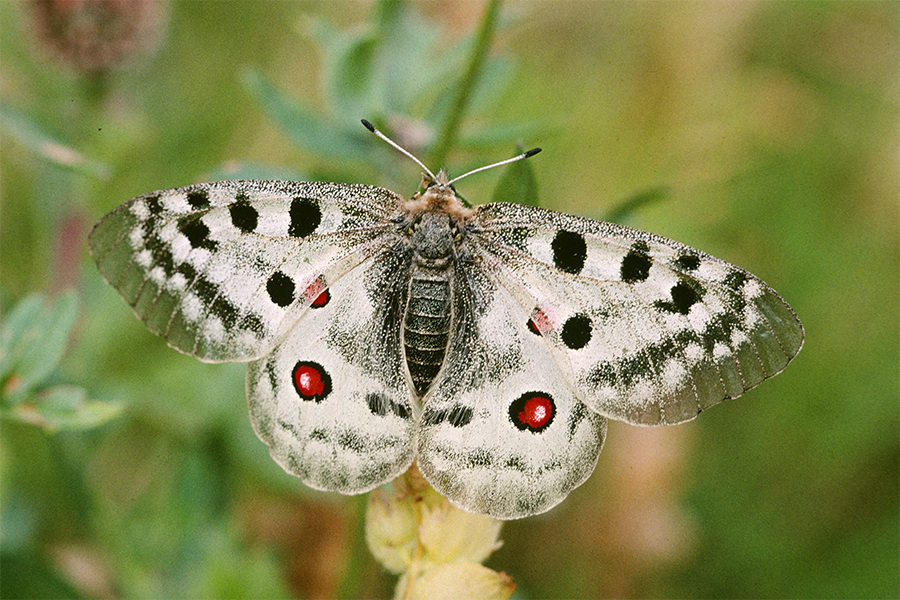 Müde und hungrig streckt er die filigranen Flügel von sich und zeigt seine wunderschönen Farben. Zwei leuchtend rote Punkte umgeben von grauschwarzen Farbtönen, in der Mitte sein eleganter Körper übersäht mit feinsten Härchen. Apollo hat keine Kraft mehr, um seine Freunde zu suchen. Er hebt langsam den Kopf und schaut, ob es irgendwo eine Distel hat, welche ihren rosaroten Kopf mit feinen Fäden der Sonne entgegenstreckt. Seine Leibspeise. Doch weit und breit kein feiner Festschmaus in Sicht.