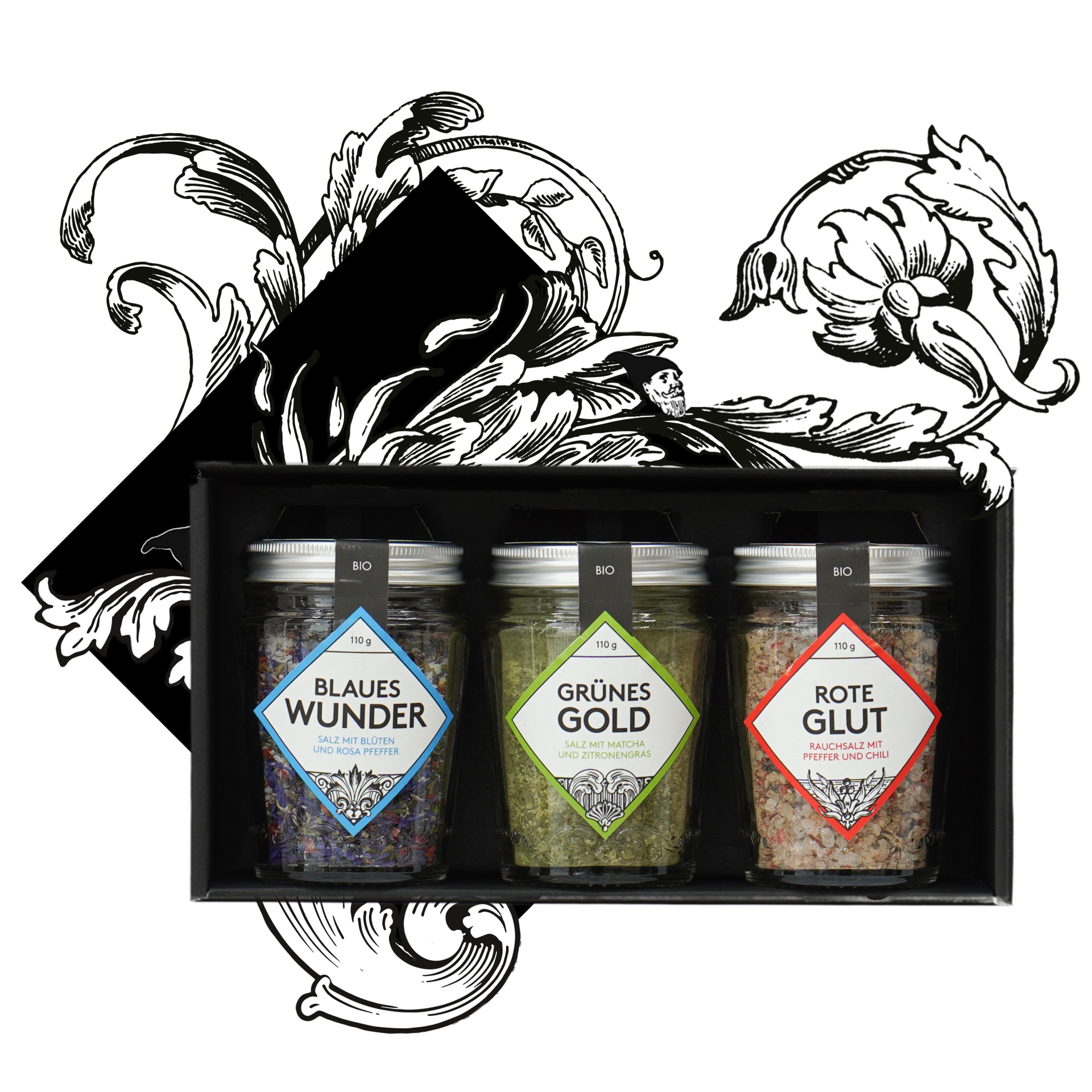 Wer sich nicht entscheiden kann oder will findet in dieser Geschenktrocke alle Gewürzsalze vereint, denn hier trifft das blaue Wunder auf das grüne Gold, und die rote Glut gesellt sich dazu – so ist für das gewisse Etwas im ganzen Menü gesorgt.