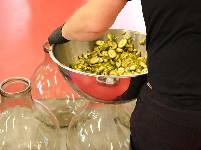 Nachdem die Baumnüsse geerntet wurden, werden sie in reinem Alkohol wochenlang eingelegt. Dieser Vorgang nennt sich auch Mazerationsprozess. Dabei werden pflanzliche Stoffe (wie Kräuter, Früchte oder Nüsse) in eine Flüssigkeit eingelegt, um ihre kraftvollen Aromen, Farben und Wirkstoffe zu extrahieren. Während dieser Zeit zieht der Alkohol die essenziellen Öle und Aromen aus den grünen Nüssen, wodurch ein intensiv aromatischer Auszug entsteht.