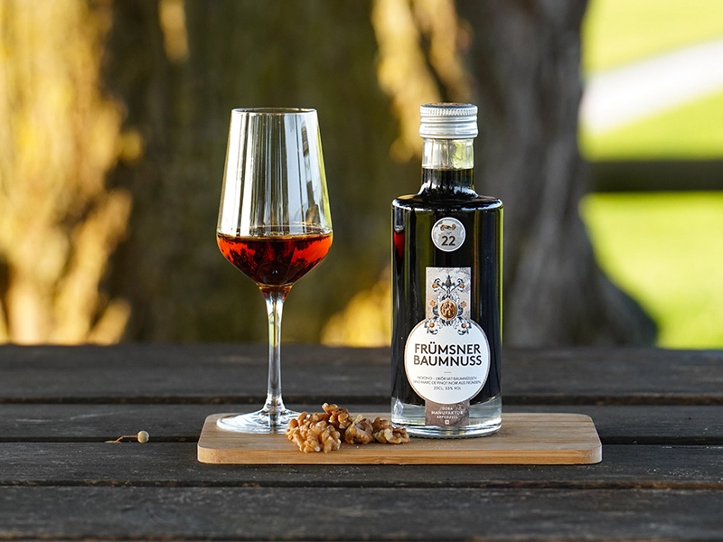 Mit dem Erfolg der Baumnussbäume stellte sich die Frage nach der bestmöglichen Verwendung der reichhaltigen Ernte. Inspiriert von der Tradition des Nocino und dem Wunsch, etwas Einzigartiges zu schaffen, entwickelten wir gemeinsam mit der Gemeinde und unserer damaligen Lebensmittelingenieurin Barbara Vierecke den No. 22 Frümsner Baumnuss Likör. Das Ziel war, die Essenz der Frümsner Baumnüsse einzufangen und in einem edlen Likör zu verewigen, der die Tradition und den Charakter der Region widerspiegelt.